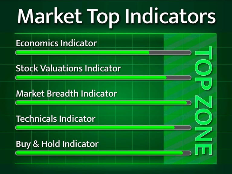 The Market Top Zone Indicators tracks the leading Indicators for a stock market toping pattern. When all indicators reach the "Top Zone" a current market top has been reached and the risk of a potential pullback is heightened.
