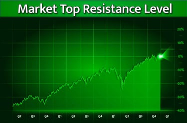The Market Top Resistance Level chart indicates resistance of the markets current upward trend. The dotted resistance line shows the most likely market top the the future 90 day quarter.