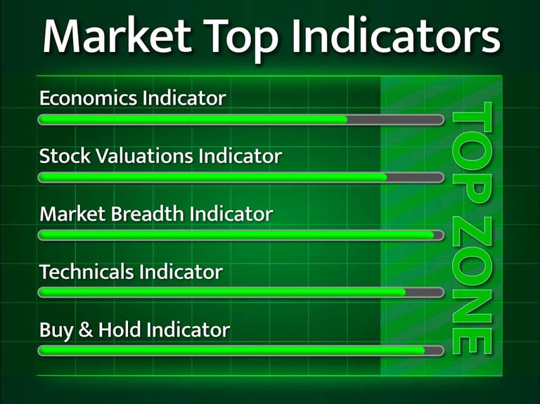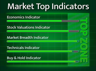 The Market Top Zone Indicators tracks the leading Indicators for a stock market toping pattern. When all indicators reach the "Top Zone" a current market top has been reached and the risk of a potential pullback is heightened.